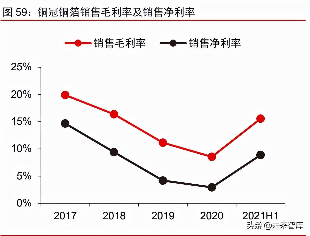公司近三年铜箔业务毛利率呈现下滑趋势,2021 年上半年显著回升。自 2018 年起, 随着铜箔行业新建产能逐步投产,PCB 铜箔销售价格回归常态甚至部分企业以低价格冲击 市场,导致公司 PCB 铜箔毛利率有所下降。锂电池铜箔业务毛利率逐年下降,主要系动 力电池行业处于由 6μm 以上产品向 6μm 及以下产品的过渡阶段,公司 6μm 以上产品整体 处于产能相对过剩状态,导致毛利率呈现逐年下降趋势。2021 年上半年,受益于下游需 求回暖,公司铜箔业务毛利率水平显著回升。PCB 铜箔和锂电池铜箔的毛利率分别回升至 16.9%和 17.9%,锂电铜箔毛利率水平高于 PCB 铜箔。