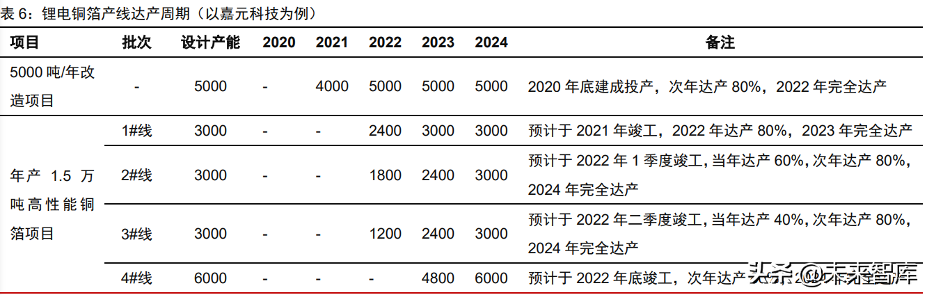 产能建设进度及达产周期将制约实际产量释放。上表统计的产能均为名义产能口径, 需要考虑企业的实际建设周期以及达产率情况,铜箔产能的达产周期将使得有效供应低于名义产能。