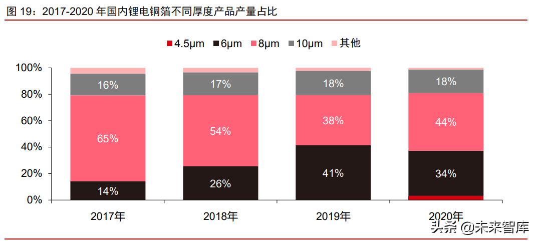 厚度的薄化是锂电铜箔行业最重要的发展趋势之一。在动力电池能量密度不断提升的 要求下,降低锂电铜箔的厚度成为相关生产企业最主要的发力方向。2017-2020 年国内锂 电铜箔行业经历了从 8μm 产品向 6μm 产品切换的过程,2019 年 6μm 铜箔产量占比达到 41%,超过 8μm 铜箔成为第一大品种。2020 年则是新产品 4.5μm 铜箔的放量元年,当年 产量达到 4745 吨,产量占比约为 3%,其中嘉元科技和诺德股份的产量超过千吨,在国内 居于领先水平。其他在 2020 年实现 4.5μm 铜箔量产的企业包括龙电华鑫、圣达电气、华 威铜箔、铜陵华创、福建清景等。4.5μm 铜箔将成为下一代锂电铜箔的主流品种,逐步替 代传统的 6-8μm 铜箔的市场份额。