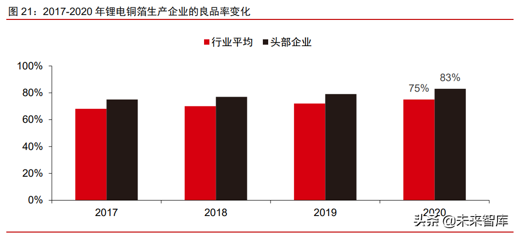 良品率是影响锂电铜箔企业盈利能力的关键因素。铜箔的良品率一般指铜箔成品与生 箔产出量之比,在稳定生产阶段,该比例主要反映的是客户订单需求与公司阴极辊宽幅的 匹配程度。因此铜箔的良品率实际反映的是企业与下游客户的绑定关系和产线深度磨合。 此外,随着铜箔朝向“轻薄化”方向发展,生产过程中的效率会降低,也会影响良品率数 据。