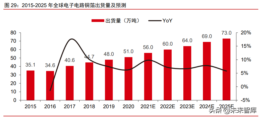 电子电路铜箔出货量预计保持稳定增长。主要系下游 5G 建设、汽车 电子、物联网新智能设备等新兴需求拉动,全球 PCB 整体市场需求增长较快,对铜箔需 求亦同步增加所致。根据高工锂电的预测,2021-2025 年全球电子电路铜箔出货量将保持 稳定增长,2025 年预计达到 73 万吨,2021-2025 年 CAGR 为 7.4%。