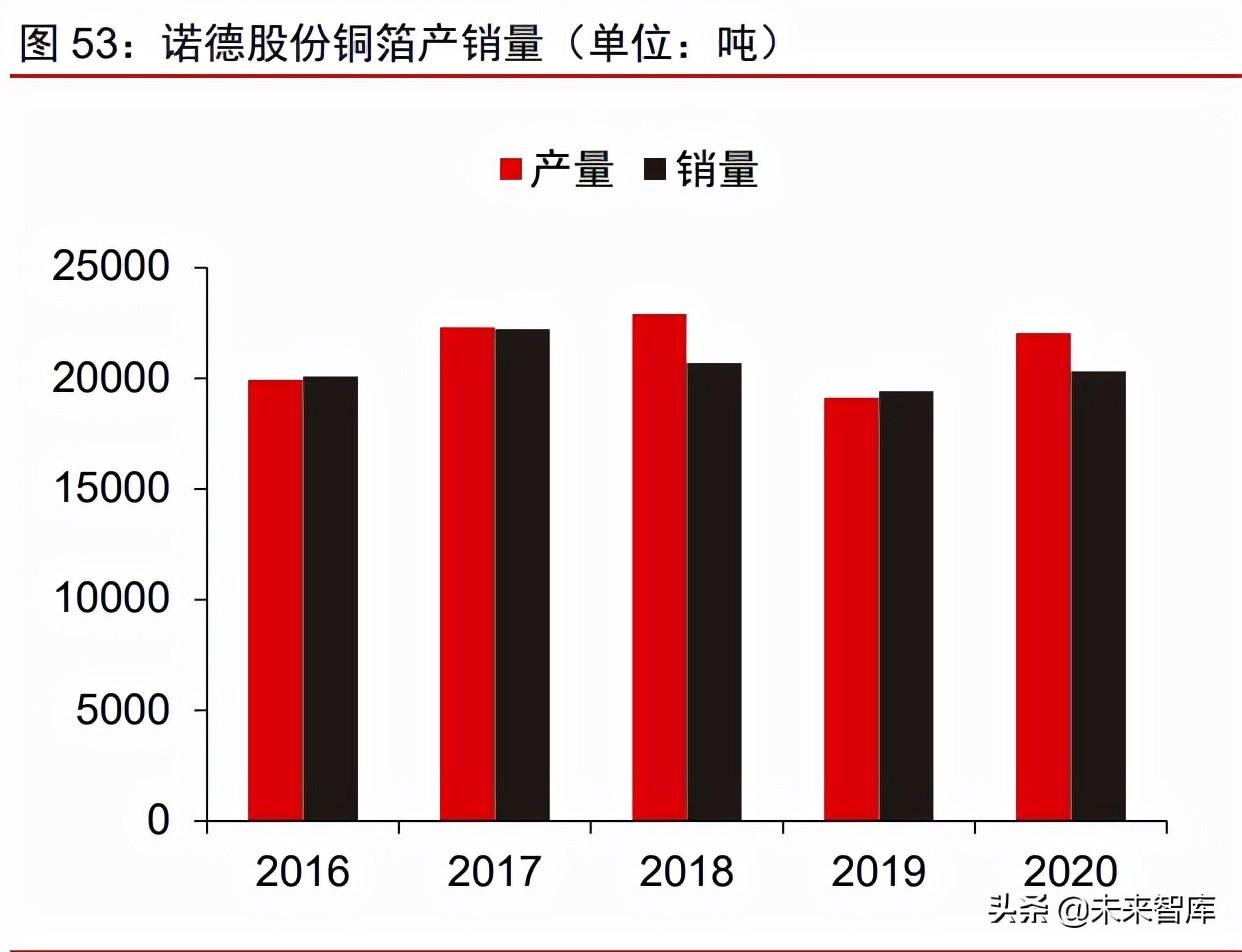 公司铜箔产销量保持稳定,位居行业前列。2020 年诺德股份铜箔产销量分别为 22043 吨、20304 吨,同比分别增长 15.3%和 4.6%,2016 年以来公司铜箔产销量保持在 2 万吨 上下,位居行业前列,且产销率保持高位。