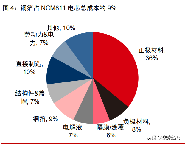 锂电铜箔是影响锂离子电池能量密度和成本的关键材料。据高工锂电测算,铜箔占锂 电池总重量比例约为 13%,仅次于正极材料、负极材料和电解液,是影响电池质量能量密 度的关键原料。成本方面,根据高工锂电的测算,NCM811 锂电池中铜箔占总成本比例约为 9%,仅次于正极材料,是影响电池成本的关键原材料之一。
