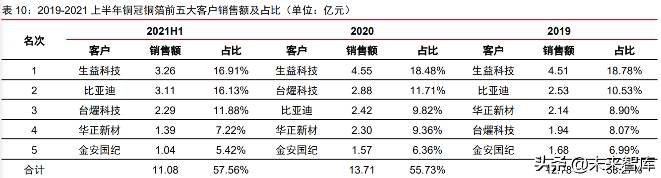 公司向 PCB 和锂电行业头部公司供货,生益科技和比亚迪分别是公司 PCB 铜箔和锂 电铜箔的第一大客户。根据公司招股说明书内容,2019-2021 上半年,公司前五大客户销 售额占比分别为 53.27%、55.73%和 57.56%。生益科技、比亚迪、台燿科技、华正新材、 金安国纪是公司的主要客户。对于 PCB 铜箔产品,公司 2019-2021 上半年对生益科技的 销售额占当期 PCB 铜箔总收入的 29.31%、26.69%和 26.46%。生益科技是世界第二大覆 铜板制造商,公司已与其建立良好的合作关系。对于锂电铜箔产品,公司 2019-2021 年上 半年对比亚迪的销售额占当期锂电铜箔总收入的 43.01%、45.02%和 58.14%。受锂离子 电池装机量不断增长的影响,比亚迪对公司锂电铜箔产品的采购量逐年增加。