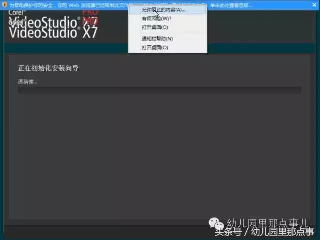 第二步:点击“安装会声会影(64bit)”,会出现安装向导界面,有的电脑可能出现界面被拦截的情况,请按照如图所示点击“允许阻止的内容”。