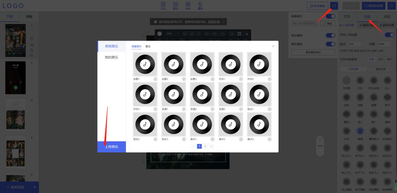 6、右侧的动画可以根据自己需求去设置,在保存发布前对记得对电子相册的音乐进行修改,可以上传自己想要的音乐。