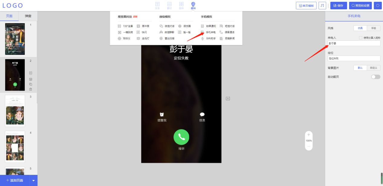 5、选好模板后就可以进行设置了,双击修改文字、删除或添加图片等等操作,按照需求进行修改,上方的导航栏有需要也可以运用上,我们可以做一个趣味的电子相册,搞笑的相册设计更会有趣,比如我们可以点击上方的【趣味】添加一个手机来电,文字都是可修改的更改成自己想要的就可以~