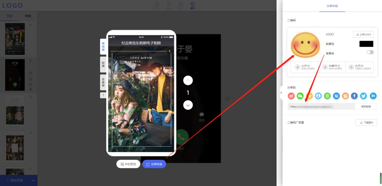 7、设置好后就可以点击预览与设置进行查看了,点击【分享作品】自动获取二维码与链接可以直接分享到朋友圈、微博等等。
