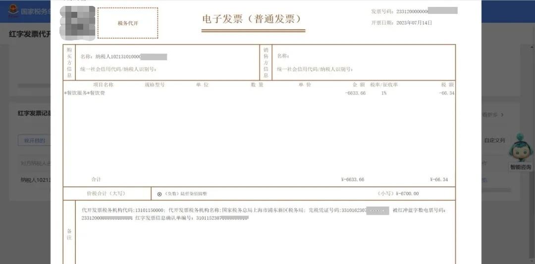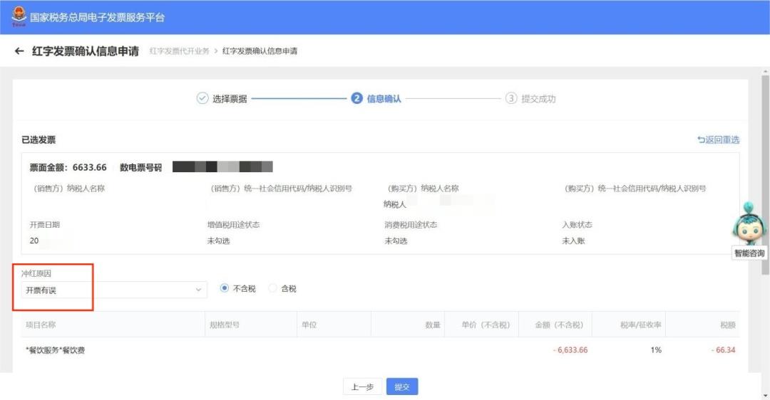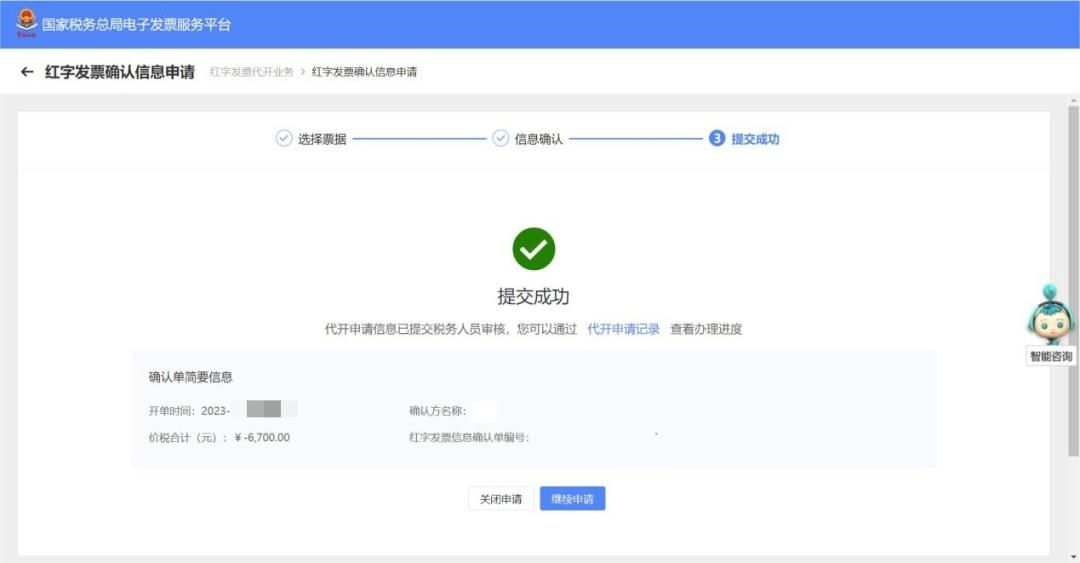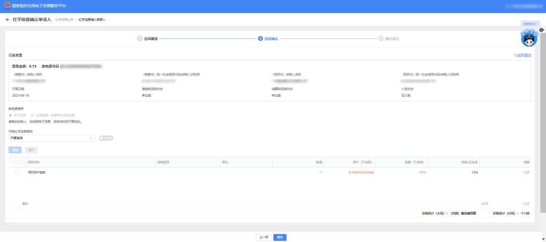 注意: 提交成功后原蓝字发票被锁定,不允许再进行入账或推送。