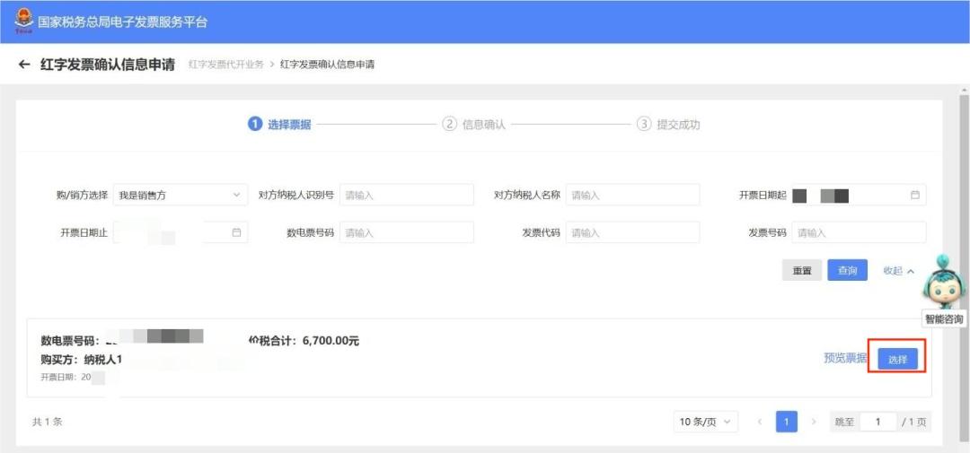 在“①选择票据”步骤中,录入查询条件,点击【查询】按钮,查询需要红冲的蓝字发票信息。如图2所示。