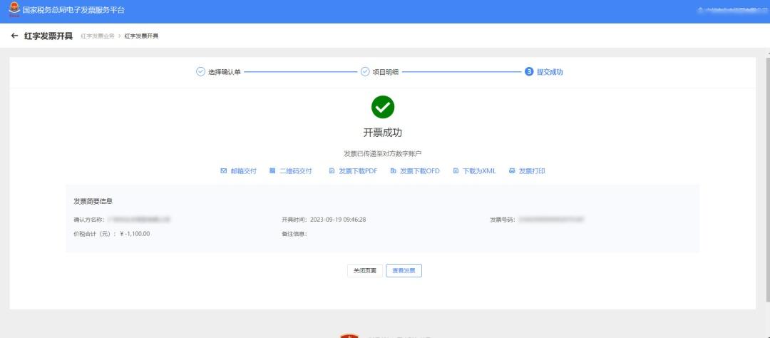 图 9红字发票开具-开具成功页面