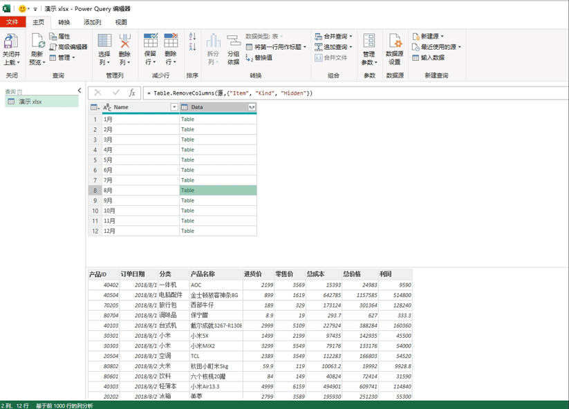 随后就会进入导航器窗口,在这里我们需要选择Excel工作簿的名称,就是【演示.xlsx】在右下角选择【转换数据】就会进入PowerQuery的编辑界面。