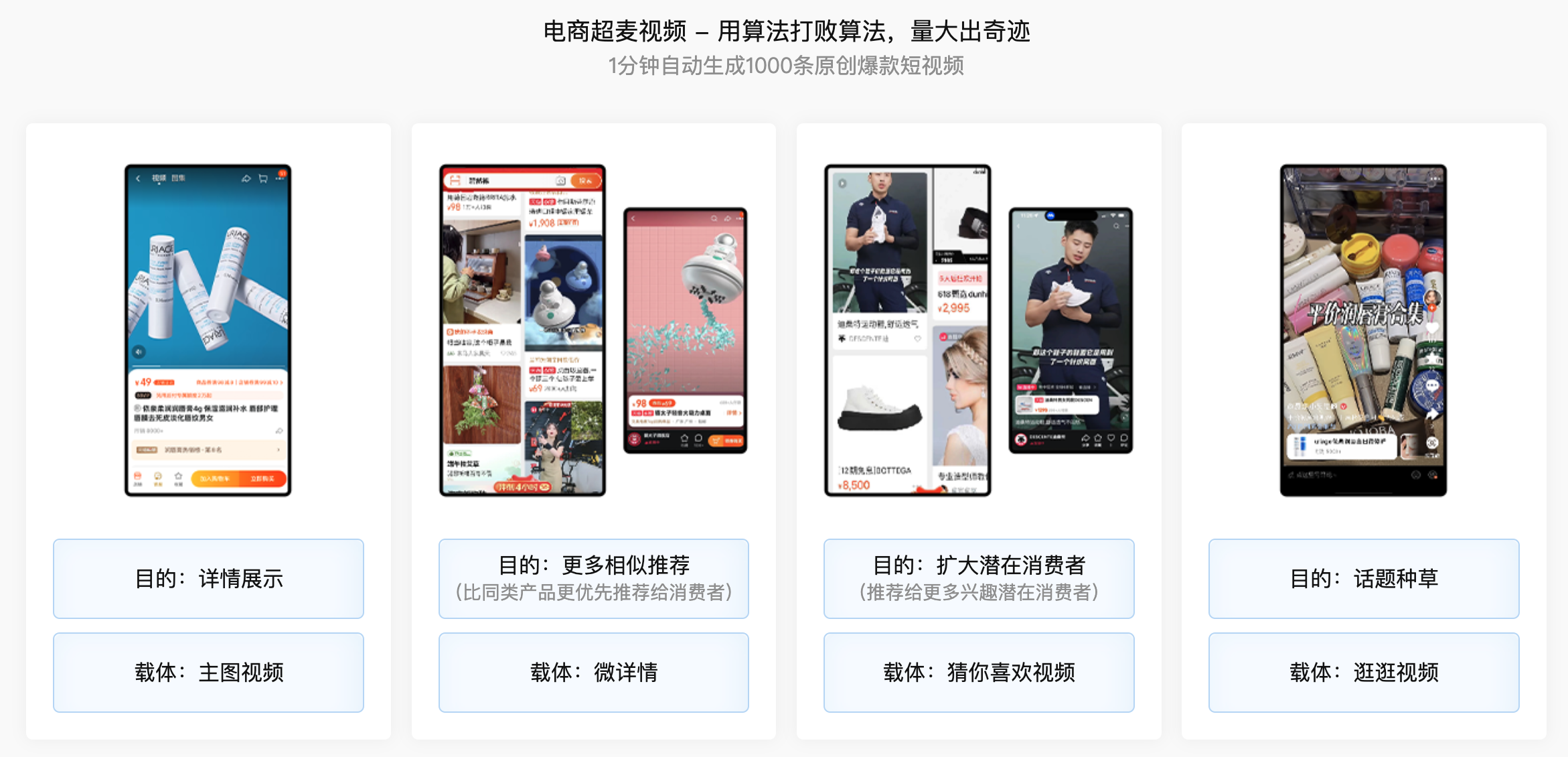 聚集小红书、抖音、微博等热门平台的内容,收集相关内容素材,随后由AI创造出全新的视频内容。其次通过对天猫、京东平台等海量用户数据进行分析,为品牌在合适的位置投放更符合用户需求的商品介绍内容,包括但不仅限于产品介绍,用户种草,用户实际体验测评等等。