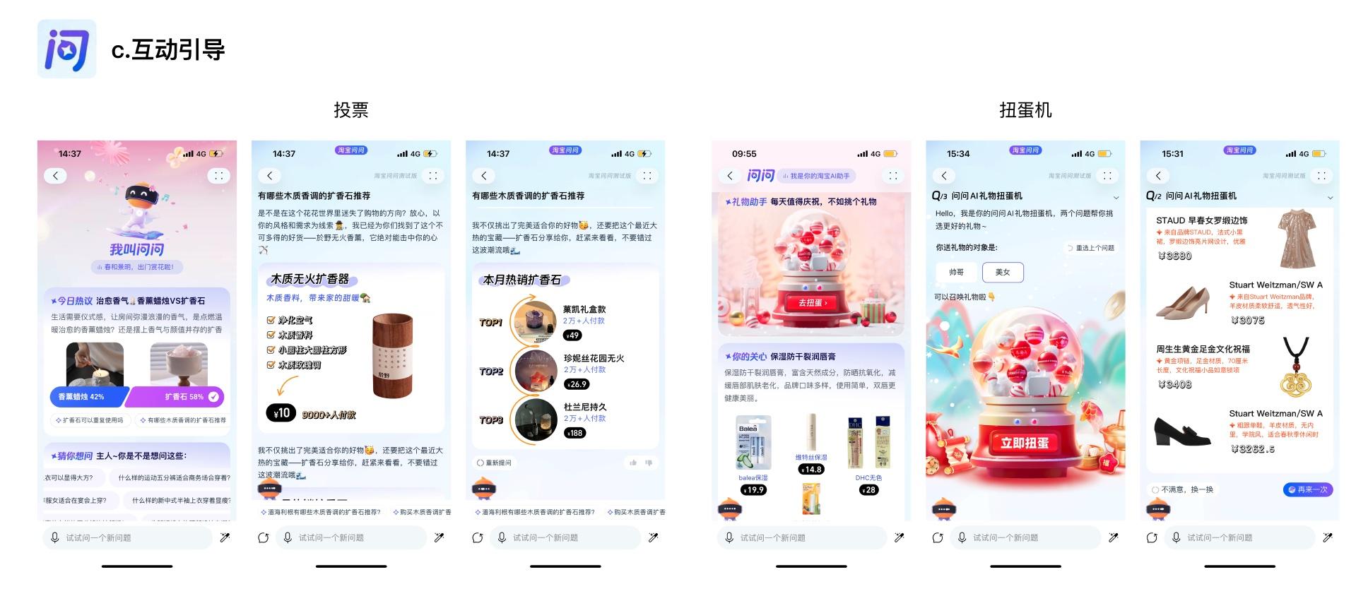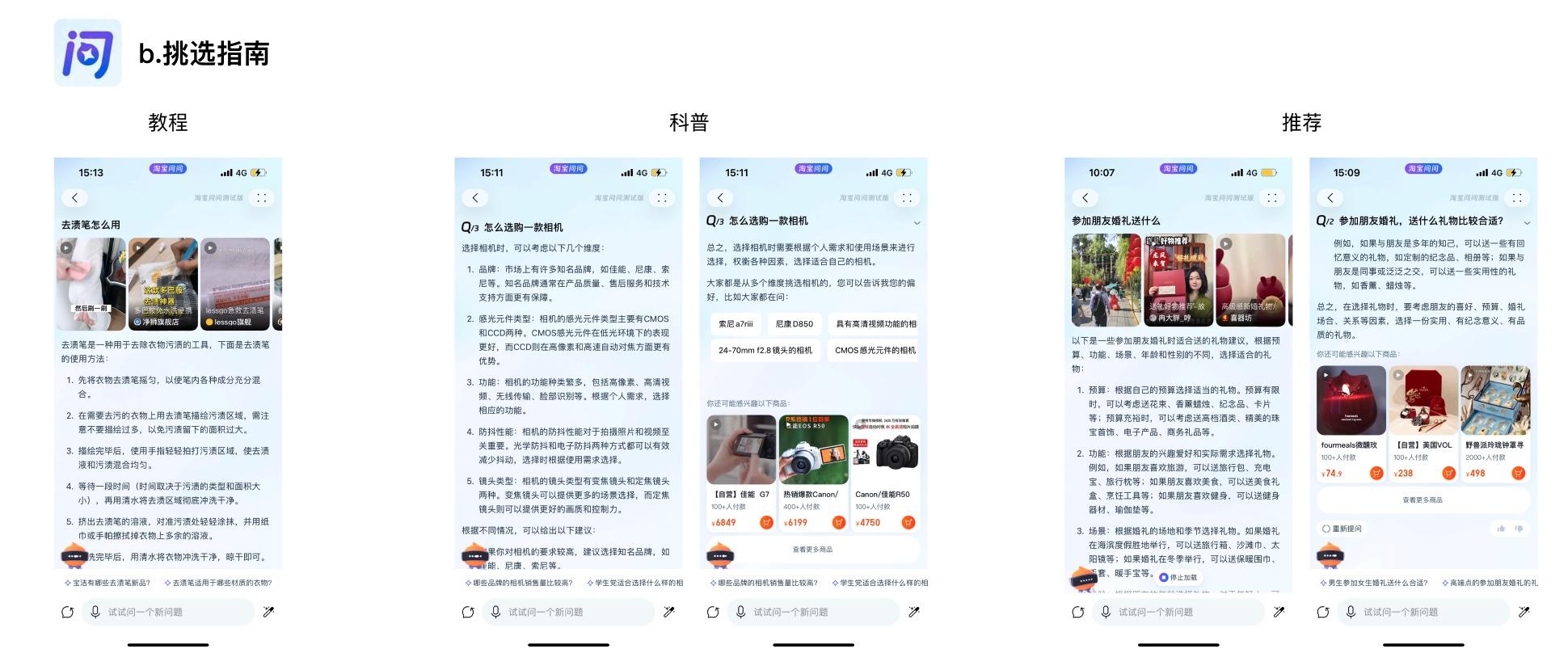 淘宝问问是淘天集团面向C端的首个AI应用,同时也是电商行业的首个生成式AI应用。无论提问任何问题,淘宝问问都会基于消费者自身的各种历史行为,为消费者推荐一个能满足其需求的商品。例如消费者不知道买什么,甚至遇到了送礼物等难题,淘宝问问都可以给到解决方案。