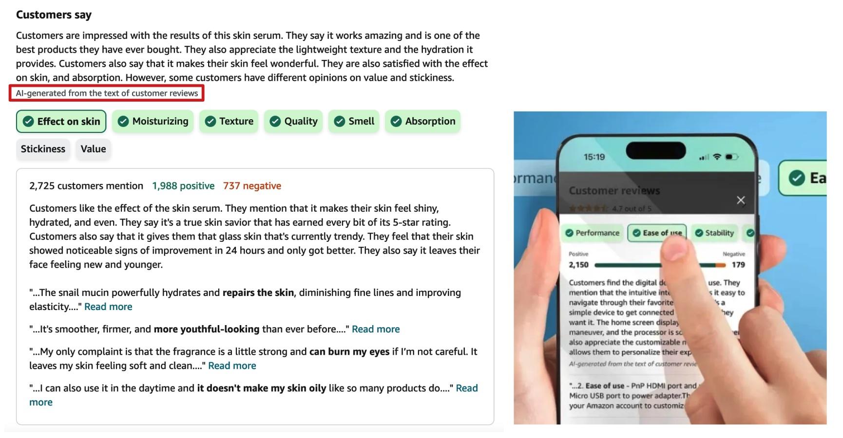 亚马逊2023年推出了基于生成式AI的产品评论摘要功能,在商品详情页上,消费者可以看见一小段介绍商品特点和购物评价的摘要,以快速判断是否要购买。主要方式为AI总结经常提到的产品描、再对评论内容进行过滤和提炼,之后评论亮点出现在对应产品属性下并显示已购买家评论中体现的情绪态度。