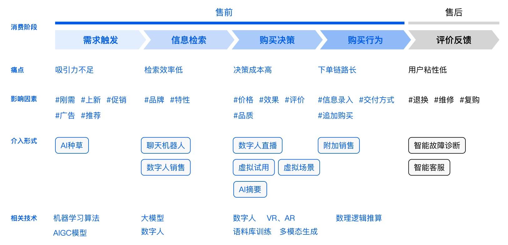 用户开始寻找满足其需求的商品或服务,通过搜索引擎、电商平台、社交媒体等渠道获取相关信息。用户可能会比较不同商品的特性、品牌、价格、评价等信息,以做出最佳选择。引入ai后,检索方式整体发生的变化。人和搜索框“交流”,通过一问一答,甚至追问多轮问答的方式,让AI提供对应的解答。这个阶段主要需要提高检索效率 。