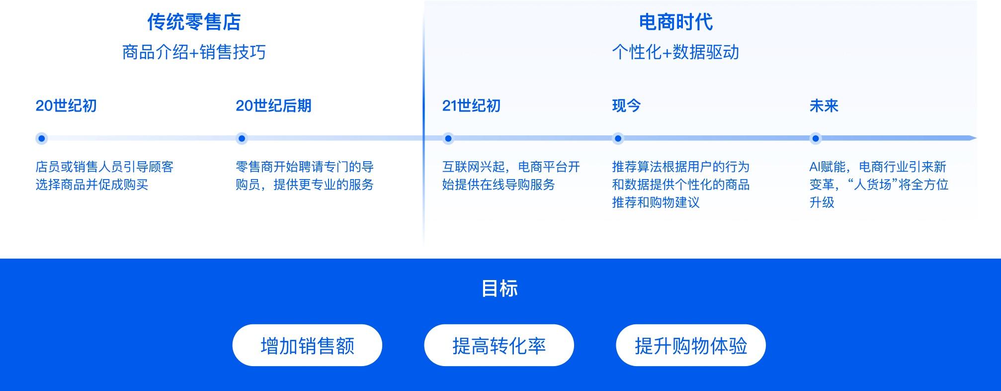 导购是为顾客提供购物指导和帮助的服务行业,通常发生在零售店铺、商场或在线电商平台,是促进销售、提升顾客体验的重要手段之一。AI+导购,是指在电商平台上利用人工智能技术提供个性化的导购服务,提高用户的购物体验和转化率,最终增加销售额。