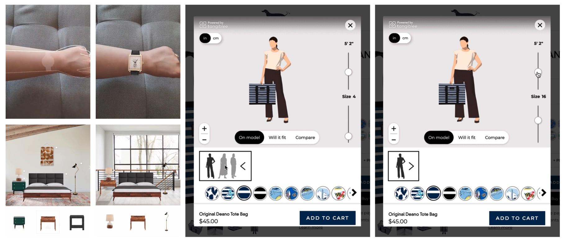 Tangiblee已经拓展实现了多种虚拟试穿体验,包括多SKU堆叠试穿、试穿产品一键对比(包括真人与模特的对比、不同尺寸与不同颜色的对比、以及自定义参照物对比等功能)、跨设备进行虚拟试穿、建造人体模型查看试穿效果等等创造性功能。