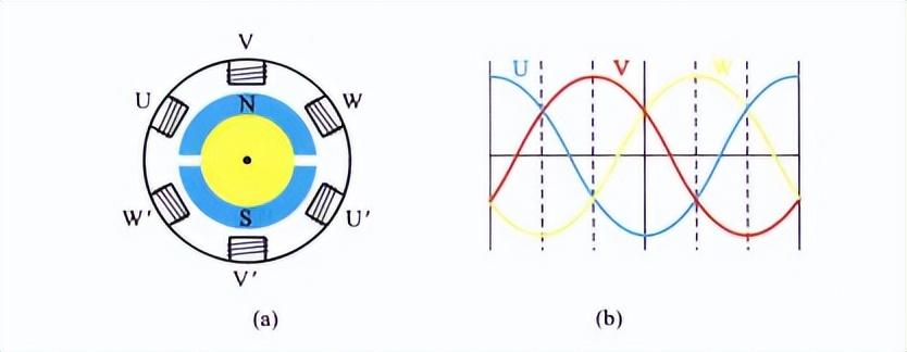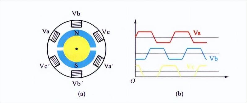 然后把定、转子互换,即把定子永磁磁极放到转子上,同时把转子绕组分布在定子上,这样就成了一台永磁直流电动机。由于转子绕组搬到了定子上,所以电刷和换向器就不需要了,所以习惯上称为永磁无刷直流电机。与普通直流电机对应,永磁无刷直流电机的转子磁场呈现均匀分布,定子绕组中则根据转子磁极的转动位置通以正方向或反方向的直流电。定子绕组中的电流控制由电力电子变换装置来完成。为了便于电力电子装置的控制,定子绕组一般分为三组或二相来控制,如图 所示。根据传动特性的需要,该电力电子装置控制定子绕组中直流电流的大小和方向。