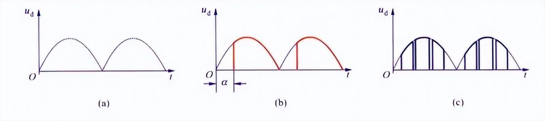 直流传动电机两端电压的调节根据供电电源是交流电源还是直流电源,分为 AC/DC的整流方式和 DC/DC.的直流斩波方式。对于AC/DC.的整流方式,电机两端电压的调节主要有相控方式和脉宽调制(Pulse Width Modulation,PWM)方式两种。如图所示是二极管全波整流桥、相控整流桥和 PWM整流桥三种 AC/DC 整流方式的电压波形的对比。