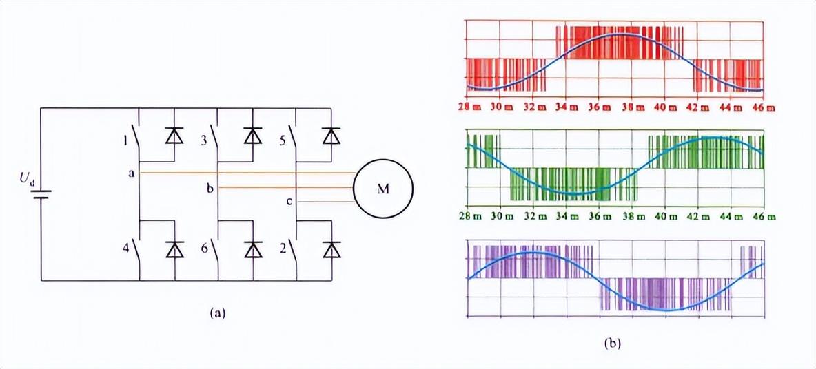 图(a)是单相逆变器的主电路图。根据开关1、4和开关2.3的闭合断开时间的不同选择,可以获得图(b)上方所示的方波交流电压,也可以获得图(b)下方所示的正弦脉冲(SPWM)交流电压。显然,逆变器输出的电压频率是可以根据需要改变的。图所示是三相逆变器的主电路和三相输出电压波形。 三相输出 PWM电压通过滤波可以等效成三相正弦波电压。