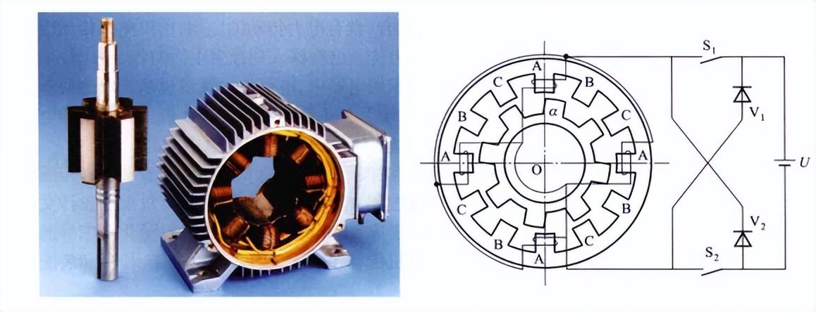 如图所示是定子12极、转子8极的三相开关磁阻电机及其控制示意图。为了实现连续旋转,定子每相电流根据转子的位置按一定的顺序开通和关断.转子位置的检测通过位置传感器进行。开关磁阳电机传动的优点是具有非常宽的调速范围和较高的效率,且鲁棒性很好。由于开关磁阻电机不是正弦波磁场分布设计,而是采用集中绕组和双内极定 、转子结构.所以其运行特征是高度非线性,常规的交流电机建模技术不能直接用来描述之。但是因为它这样的结构.它的噪声和转矩脉动比其他电机大。但可L以运行在环培条件很恶劣的场合,所以非常适用于航空航大系统传动中。