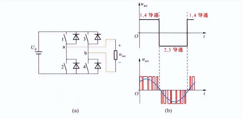 目前交流电机最为普遍的调速方法,无论是同步电机还是异步电机,都是通过调节定子电压(电流)的频率f来实现。如何来调节加载电机两端电压的频率呢?下面就以DC/AC 单相变换的逆变器工作原理来说明。如图 所示是单相逆变器的工作原理图。