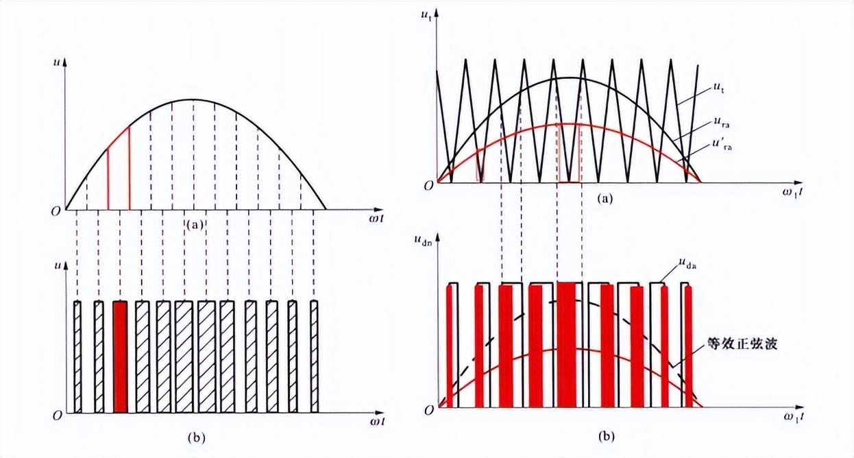 图(b)下方波形和图(b)波形实质上就是1964年提出的分谐波控制的脉宽调制技术原理的应用。分谐波脉宽调制技术的基本原理是;面积相等而形状不同的窄脉冲加在具有惯性的环节上时,其效果基本相同。