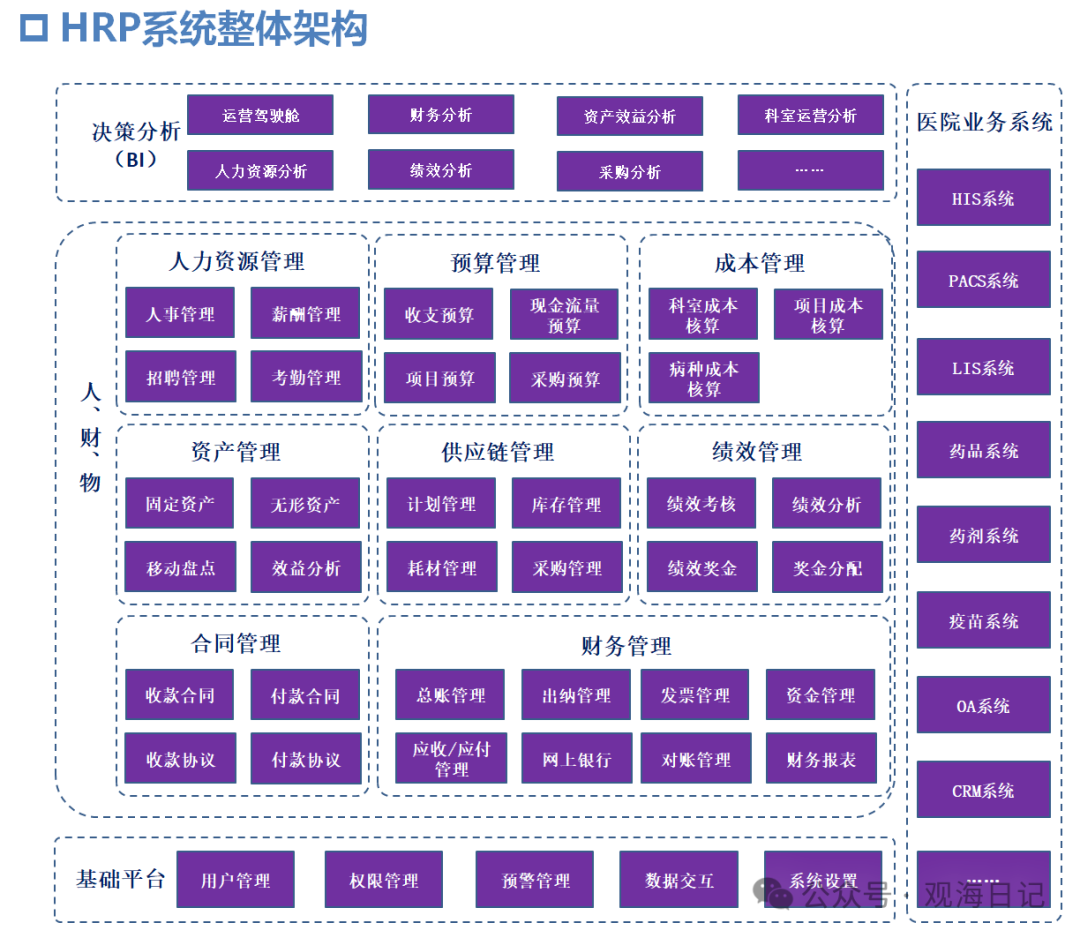 后面观海会以“总到分”的结构,逐步拆析各个子系统或者功能模块,围绕医院内部管理的统一管理有信息化系进行逐个拆解并进行单独介绍,本次内容仅做一个整体的介绍。