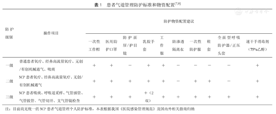 1.对NCP患者进行气道管理至少实施二级防护(表1)。