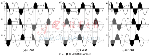 感应电机在7.14 Hz下能稳定运行,如果直接切换到电网工频50 Hz,由于频率的过渡太大,会产生短暂电流上升和转矩下降。可以在7.14 Hz切换到工频电网时适当降低电压,然后使用斜坡升压的方法把电机电压提升到额定电压,这样在空载或轻载下足以完成频率的切换,但是重载或满载时,电流显著增大,转矩下降明显,甚至转速会下降到接近于0,再斜坡升压时已相当于零速开始调压调速起动,达不到提升起动转矩的目的。在7.14 Hz到50 Hz间插入一些中间频率段,比如12.5 Hz、16.7 Hz、25 Hz,可使各频率段之间平稳切换。再根据实际负载情况在切换到工频时适当加入一段调压以实现电机切换时降低起动电流。通过实验验证,空间电压矢量控制下分频系数为1、3、4、7时所得到的是正相序电压,电机可以良好运行,可以通过这些分频下电压矢量的平移与合并实现变频。2分频属于负序电压只用作过渡频率运行1到2个周期。只要各频率段过渡过程触发角选择合适就可以实现电机启动时频率的无扰动切换,其各分频导通电压波形如图4所示。