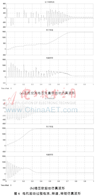目前,探索如何以晶闸管调压电路为基础实现有级变频软起动成为解决上述问题的关键。文献[5-6]是国内外最早提出离散变频控制思想的文章,其分析和仿真了离散频率的产生和运行过程,提出正负序电压选择方法,但是这种软起动方式转矩脉动大[7-9],有时无法起动电机也会因为谐波污染电网。专利[10]及文献[11]初次提出正弦空间电压矢量软起动方法,但其原理论述依然局限于直流供电下的空间电压矢量,没有交代清楚正弦空间电压矢量下的电机定子磁链形成轨迹,也没讨论起动电机动态过程和仿真验证。