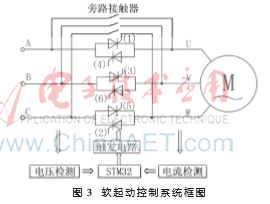 正弦空间电压矢量软起动器的控制系统整体框图如图3所示。主要由三相反并联晶闸管主电路、电压检测、电流检测、触发电路、微处理器(STM32)等部分组成。STM32通过电压检测电路采集电压,对三相电压进行缺相检测和相序检测,同时对起动时间进行计数,其根据软起动模式、分频级数以及触发角等参数,对电压信号处理,按照原理中阐述的控制方法选择正确的时刻给相应的晶闸管发出触发信号,触发信号经过触发电路后触发晶闸管导通,实现正弦空间电压矢量软起动。起动完成后,通过旁路接触器将空间电压矢量软起动器旁路,电机开始全压运行。