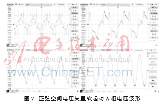 搭建STM32为核心控制器、三相反并联晶闸管为主回路的电机软起动硬件平台,将正弦供电的空间电压矢量原理和有级变频的起动策略应用于软起动器,实际运行,测试数据。实验所用电机额定功率22 kW,额定电流42.5 A,磁粉制动器作为可调负载。7.14 Hz、12.5 Hz、16.7 Hz、50 Hz频段下的实际电压波形如图7所示。其各自包络线所形成的正弦波形周期都是与各自分频相对应的。