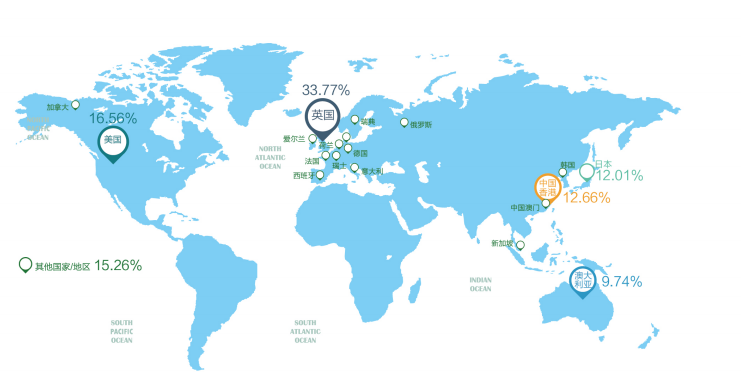2019届毕业生有308人选择出国(境),占5.74%,其中本科毕业生298人。出国(境)毕业生目的地排名前三的是:英国33.77%,美国16.56%,中国香港12.66%。 出国(境)毕业生主要就读于英国爱丁堡大学、香港中文大学、香港理工大学等院校。