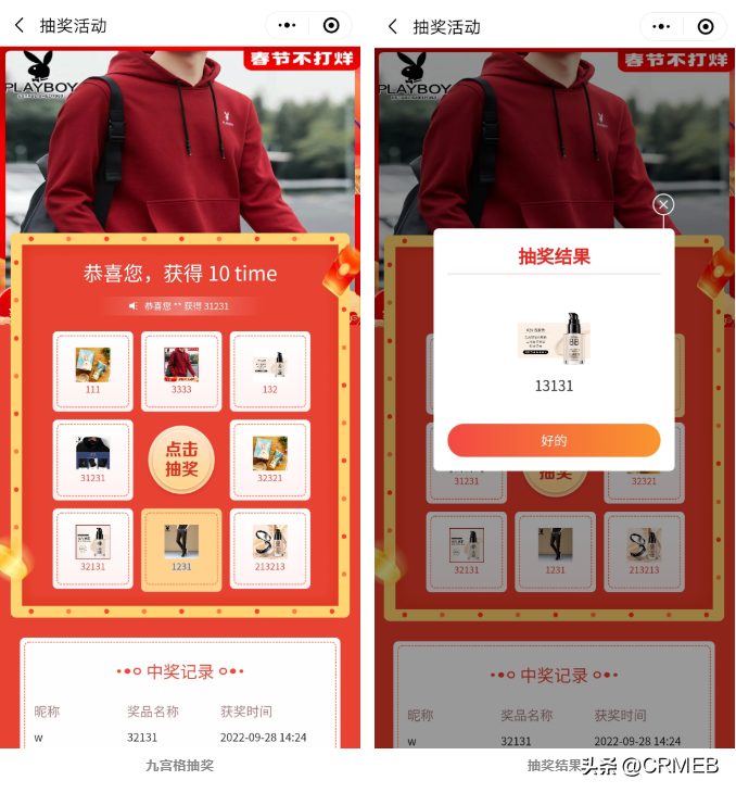 支持用户在下单成功、评价成功、积分商城等操作流程中参与九宫格抽奖活动,奖品可设置商品、积分、红包、优惠券等。