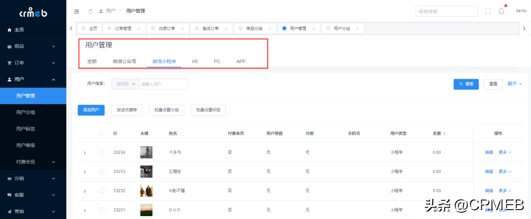 用户管理系统可区分微信用户、小程序用户、H5用户、PC用户等多种类型用户,方便添加用户标签进行分组管理。