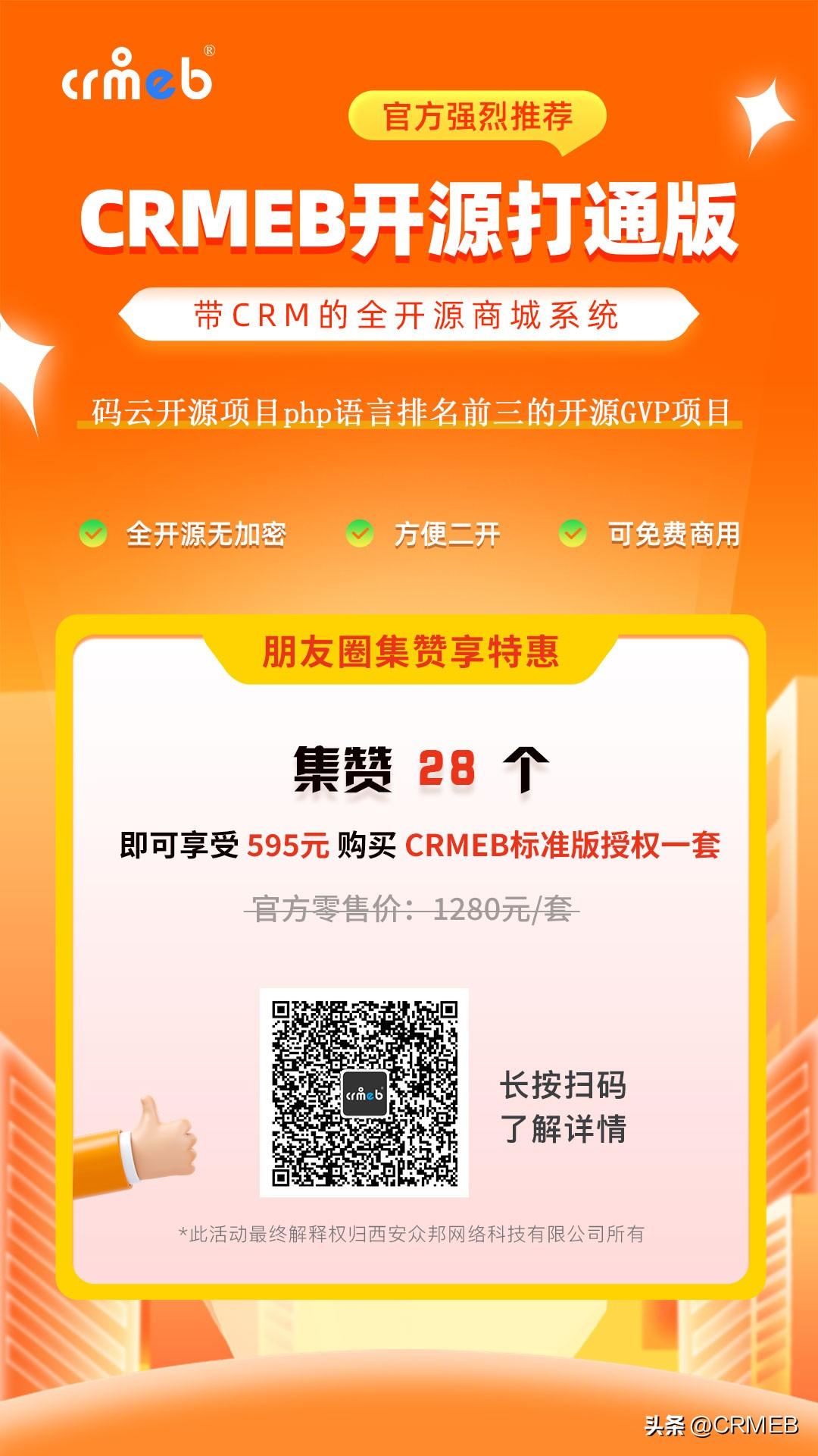 强烈推荐一款带CRM的开源电商系统全开源无加密 方便二开 功能强大 可以免费商用即日起,转发此海报至朋友圈,集赞满28个,即可595元购买CRMEB标准版一套,官方零售价:1280元/套。