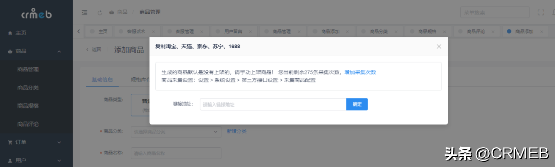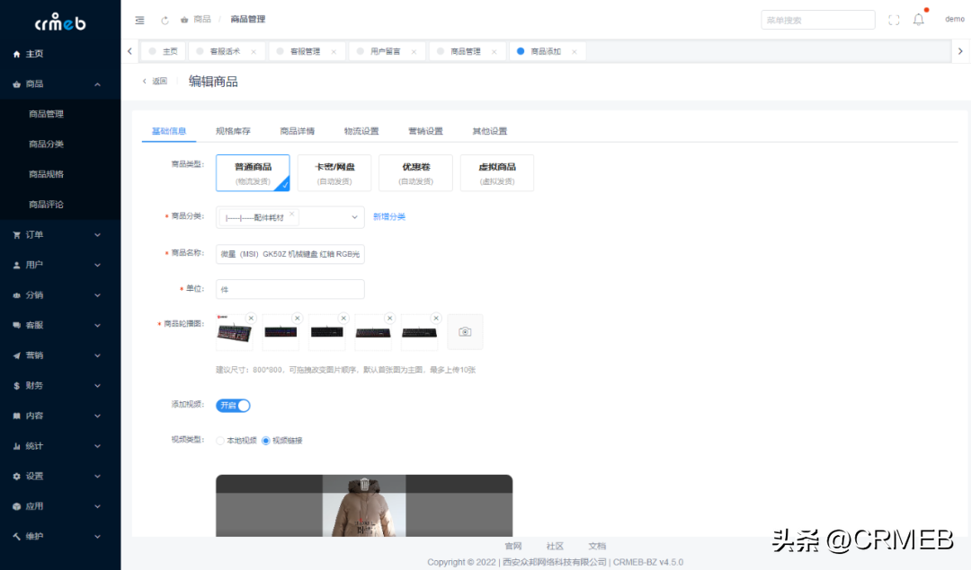 商品设置可对商品进行分类管理,可设置商品详情、商品规格、商品预售、商品限购、商品配送方式等,支持商品评价,可上传商品视频、海报等素材对商品进行介绍,也可以快速采集淘宝、京东等平台的商品。另外,还可以区分卡密商品、优惠券商品、付费会员商品等多种类型商品。