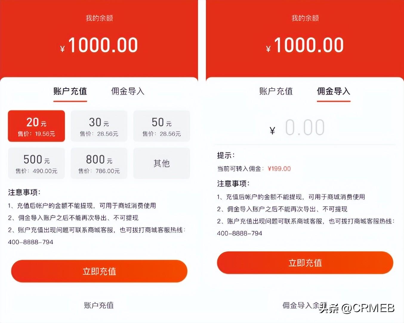 系统可设置余额充值赠送优惠,支持用户充值消费,也支持用户将佣金直接导入余额使用,增强与用户之间的互动,提高用户活跃度与复购率。