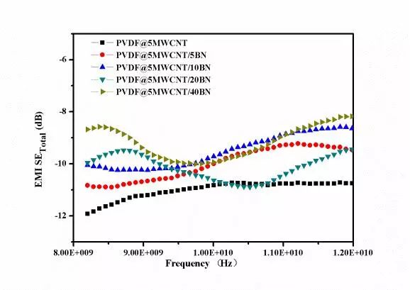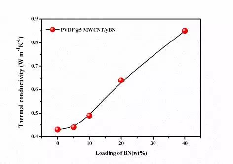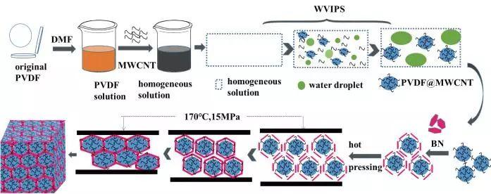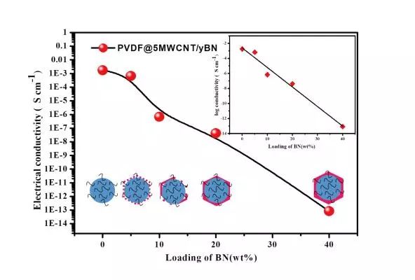 电子封装材料在某些场合下具有电绝缘特性的要求,而目前碳系复合材料在改善导热性能的同时,通常会引起导电性能的提升,从而影响了封装材料的实际应用。该课题组以聚偏氟乙烯(PVDF)为研究对象,构筑了多壁碳纳米管(MWCNT)与氮化硼(BN)的隔离双网络结构,满足材料导热与抗干扰性能的同时,兼顾了电子封装材料的电绝缘性能。首先原位制备了PVDF@MWCNT复合微球,在微球内部形成了导电网络又提高了PVDF的导热性能;然后在微球外部,采用绝缘BN导热填料构建了完整的导热网络通路,并通过整体包覆降低了复合微球的导电性能,从而使得复合材料在实现导热和电磁屏蔽性能同步提升的基础上,兼具有良好的电绝缘性能。