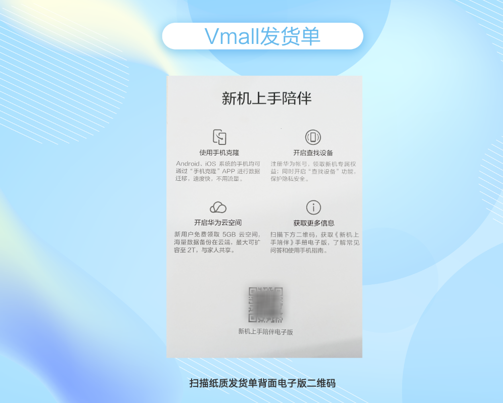 收到新机后,扫描纸质发货单背面电子版二维码,即可浏览电子版新机陪伴手册。