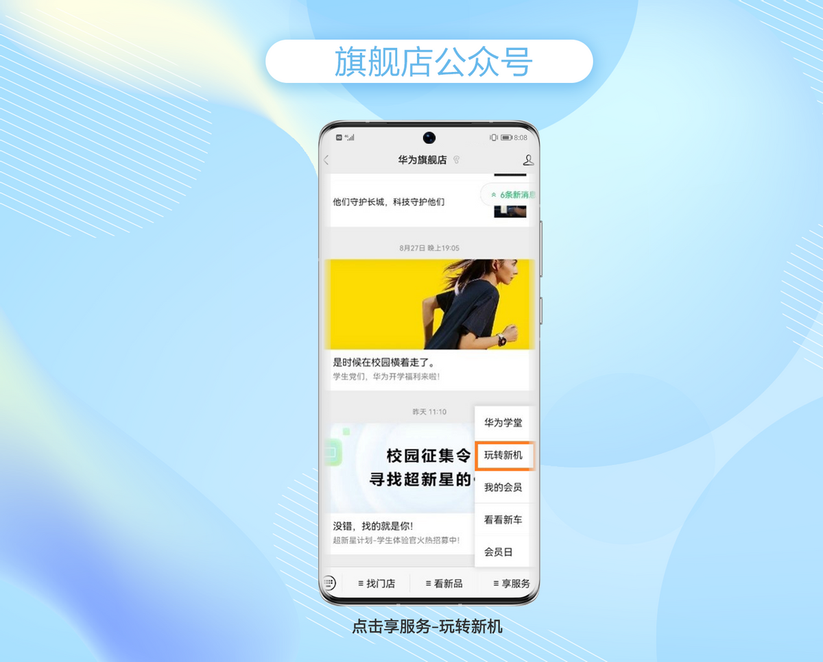 搜索关注【华为旗舰店】公众号,点击享服务-玩转新机,即可获取新机陪伴手册。