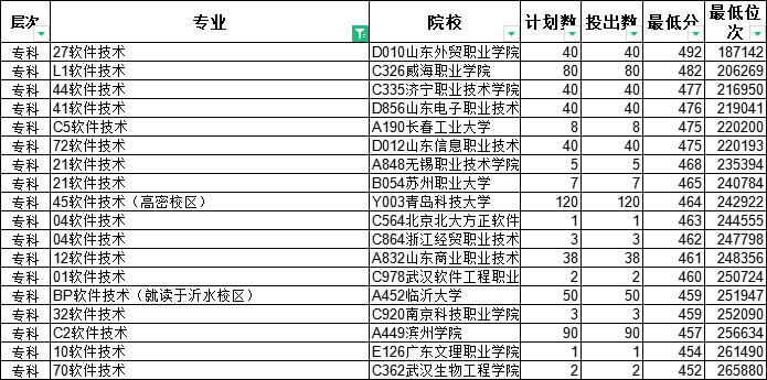 2020年,有123所院校计划在山东招收软件技术(专科)专业4658人,第2次志愿投档投出3941人,投档率85% 。录取分数最高的学校是山东外贸职业学院,最低分492分(位次187142名)。