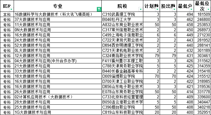 2020年山东大数据技术与应用专业专科录取情况(部分)