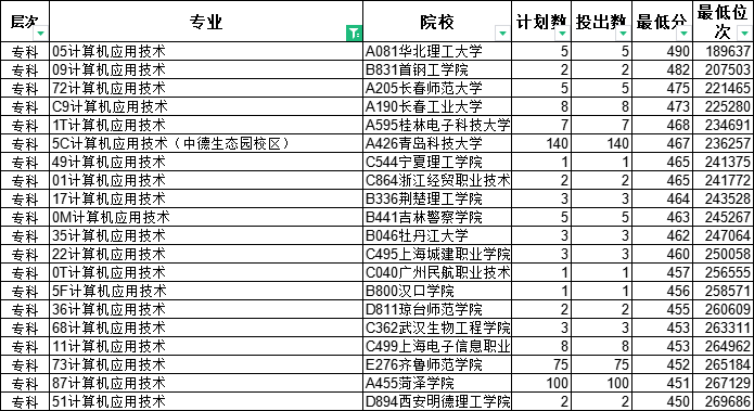 2020年,有142所院校计划在山东招收计算机应用技术(专科)专业6527人,第2次志愿投档投出4997人,投档率77% 。录取分数最高的学校是华北理工大学,最低分490分(位次189637名)。
