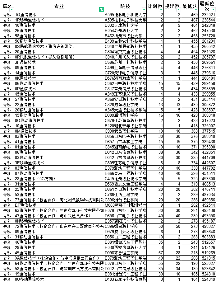 2020年,42所院校计划在山东(移动)通信技术(专科)专业786人,第2次志愿投档投出617人,投档率78% 。录取分数最高的学校是桂林电子科技大学,最低分469分(位次232021名)。