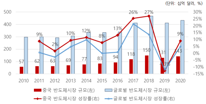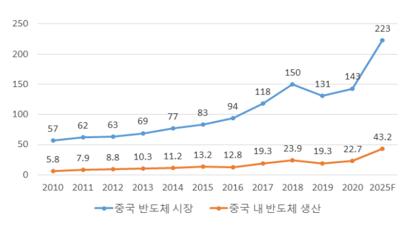 2016年以后,中国半导体市场以年均12%的速度快速增长,同期全球半导体整体年均增长率达到6%的两倍(同期除中国外的全球半导体年均增长率仅为3%)。2019年,受美中贸易摩擦和世界半导体需求减少的影响,增长率曾放缓至-13%,但2020年再次增长9.0%,目前,中国作为世界最大的半导体市场承担全球半导体消费的60%。 但与市场规模相比,中国半导体自给率相当低,以2020年为准,中国半导体自给率为15.9%,远远不及《中国制造2025》中提出的目标——2020年达到40%和2025年达到70%。