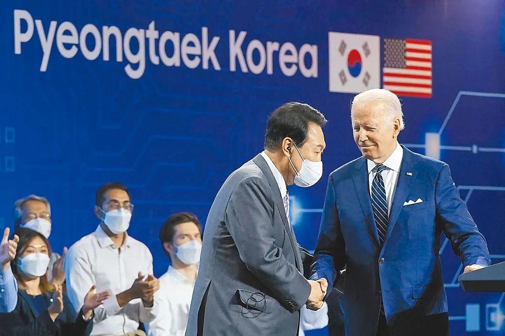 ▲ 2022年5月20日,美国总统拜登(右)飞抵韩国访问,第一站就与韩国总统尹锡悦一道视察三星电子平泽半导体厂。图源:美联社