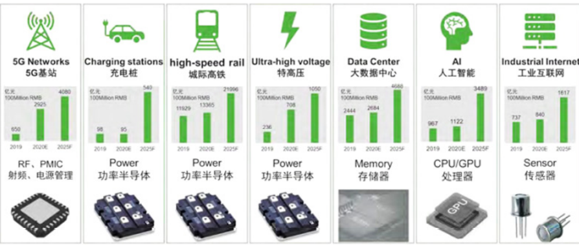 中国在《“十四五”规划和2035年远景目标纲要》提出,到2035年将达到2020年GDP两倍规模增长的目标。实现这一宏伟目标,需要通过技术创新在15年内实现年均4.73%的经济增长。中国为此采取了强调“双循环(Dual Circulation)发展新发展格局战略”和“技术创新”的自立自强式增长战略,以及作为具体手段构建新增长动力的“两新一重”政策,即新基建、新型城市化、重大基础设施(交通、水资源)投资政策。其中,创新主导型增长战略的核心是新基建投资政策,大致可分为信息基础设施、融合基础设施、创新基础设施建设,这些领域的共同点都是半导体相关性。CCID(China Center for Industry Development, 中国电子信息产业发展研究院)预测, 今后5年中国将对新基建投资1兆4千亿美元。具体来讲,新基建投资的7大领域是:5G网络、电动车充电站、高速铁路、UHV送电、数据中心、AI、产业IoT。